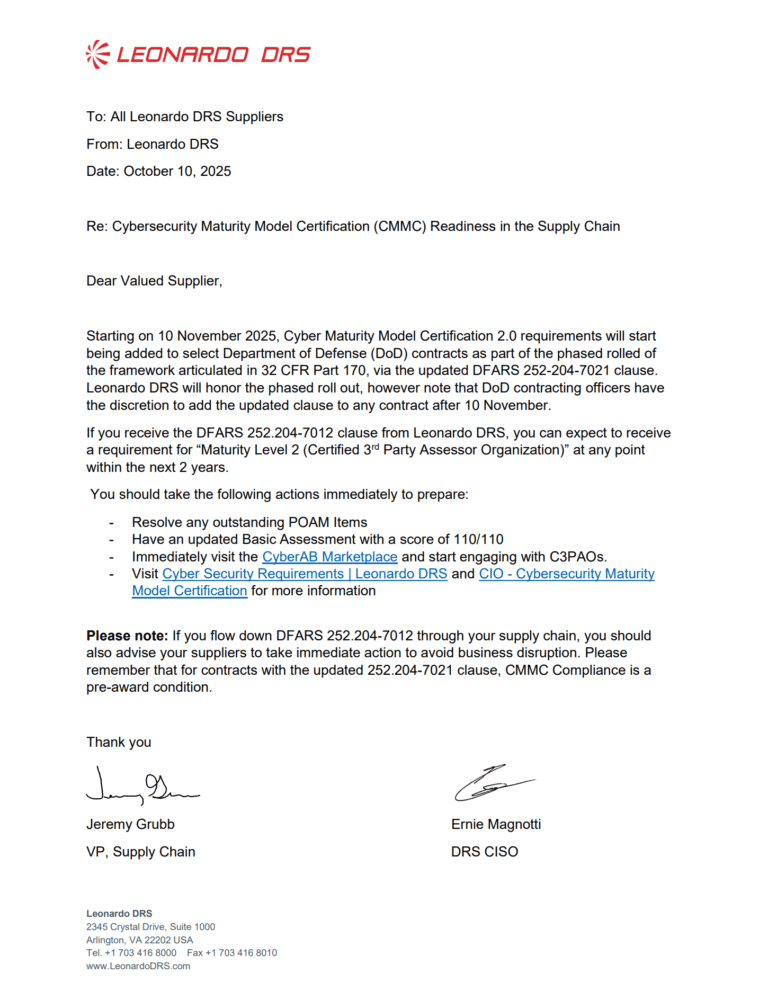 Leonardo DRS has released a notice to its suppliers about upcoming CMMC 2.0 requirements, which will begin appearing in select Department of Defense contracts on November 10, 2025.